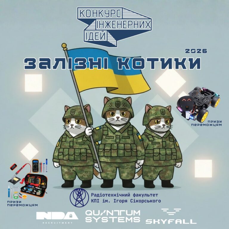 🔈 Оголошуємо початок приймання проєктів на щорічний Конкурс Інженерних Ідей: Залізні котики 2026 на базі Радіотехнічного факультету КПІ ім. Ігоря Сікорського Ворог намагається зламати нас, але йому це не під силу, бо наші захисники — ЗАЛІЗНІ КОТИКИ 😻 Українські ЗАЛІЗНІ КОТИКИ — справжні захисники своєї Батьківщини, в серцях яких горить віра в незалежність та готовність…